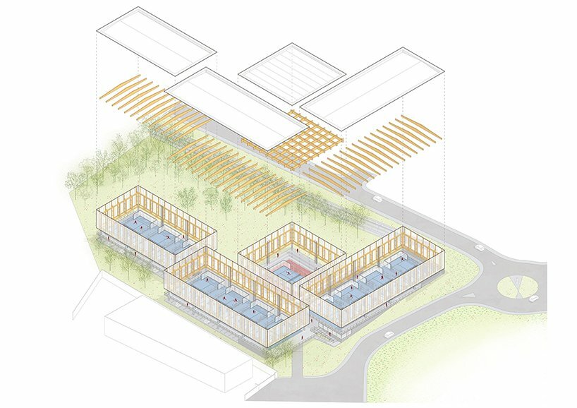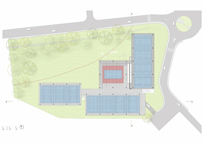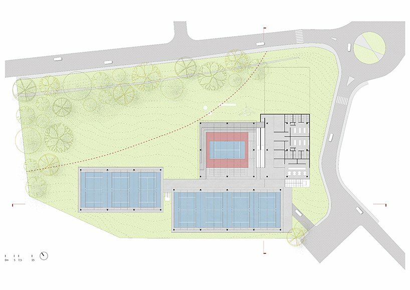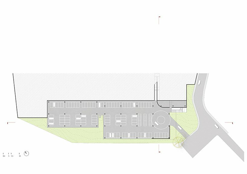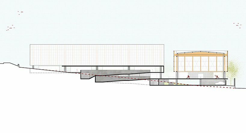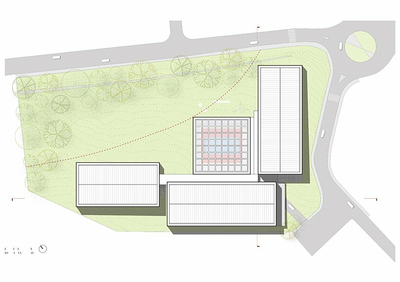 the project sits like a ring placed over the terrain, with its funnel-like roof forming a shaded perimeter walkway and an introverted core.