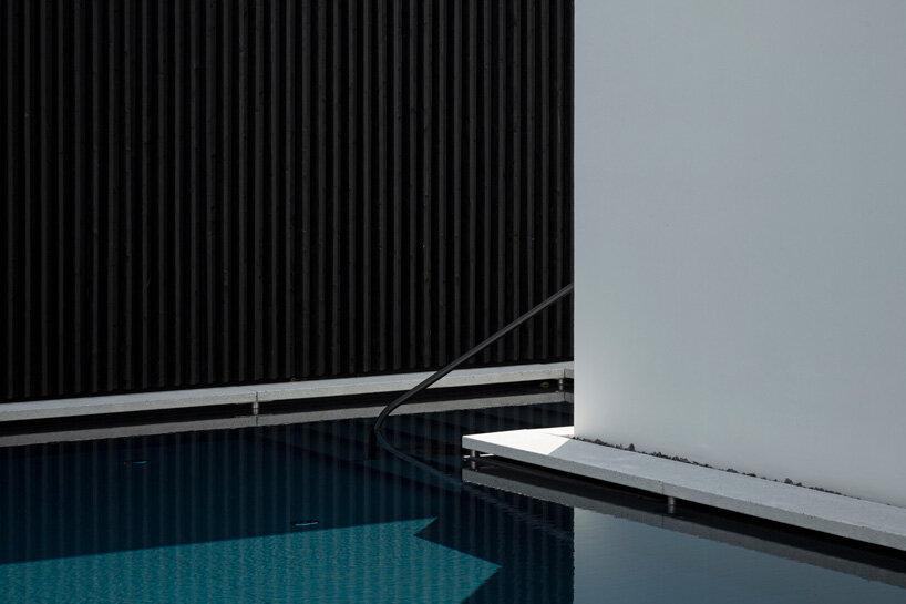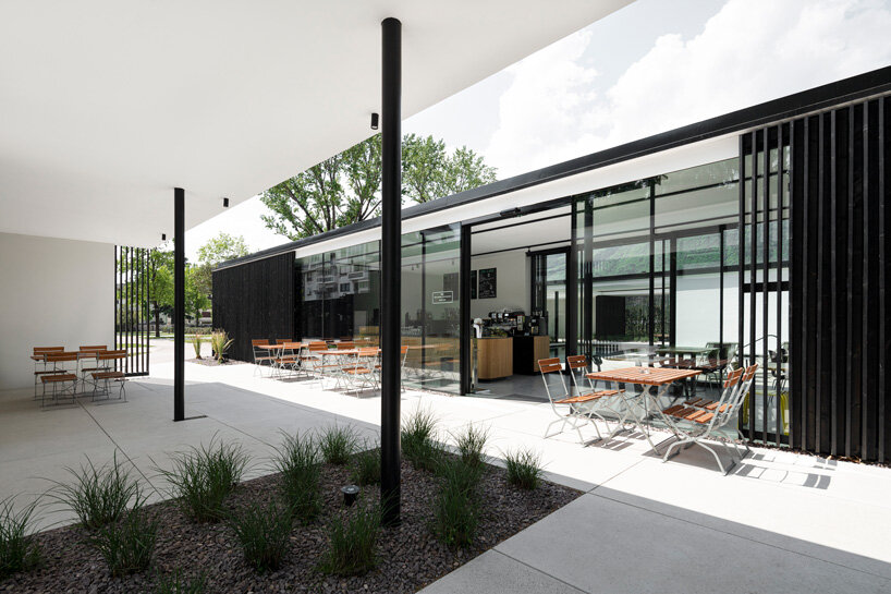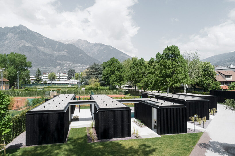 the architecture is simple and sympathetic to the surroundings, its low-lying form and black exterior don’t try to compete with the incredible mountain scenery in the background. the black timber exteriors, made from locally sourced wood, are contrasted with white to create a stylish monochrome look. in addition to its contemporary character, LIVE merano camping also prioritizes environmental awareness and operates as a completely plastic-free campsite.
