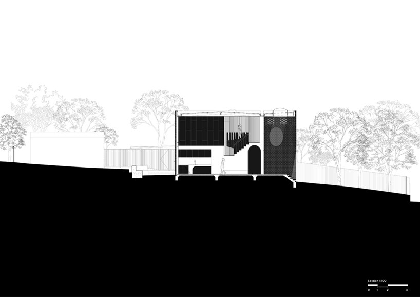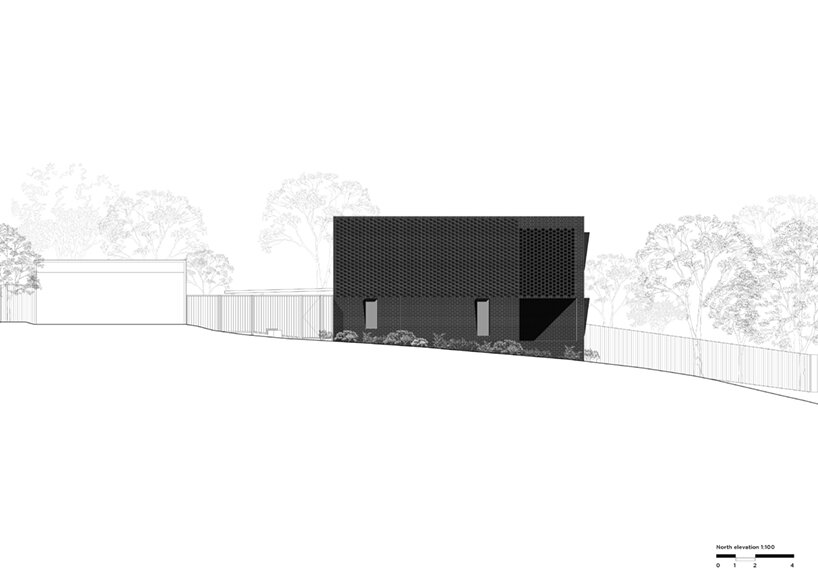 cuboid house perches on the slope of a leafy suburban neighbourhood elevated from a busy main road. designed for a close-knit family with young adults living at home, the project takes shape as two self-contained sleeping areas so the family can enjoy living together as well as apart. the layout sees a series of deep thresholds or anterooms, finished in black to demarcate the thresholds between private spaces.