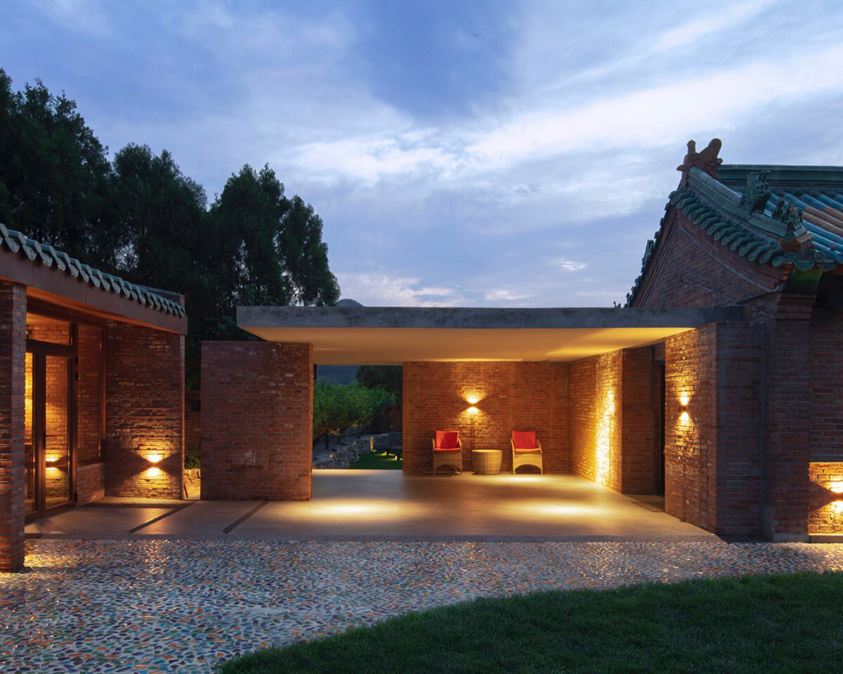 the north courtyard offers a tranquil space with red brick and a view of the Great Wall