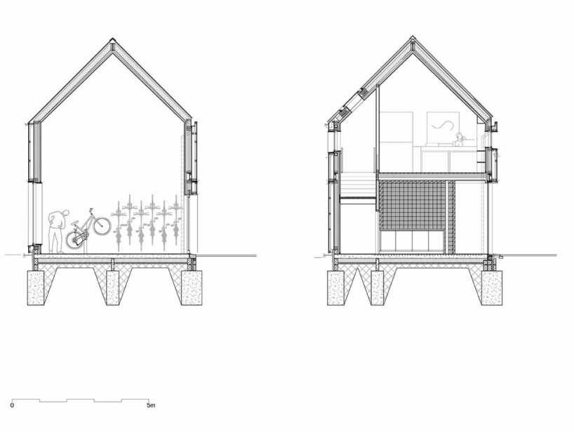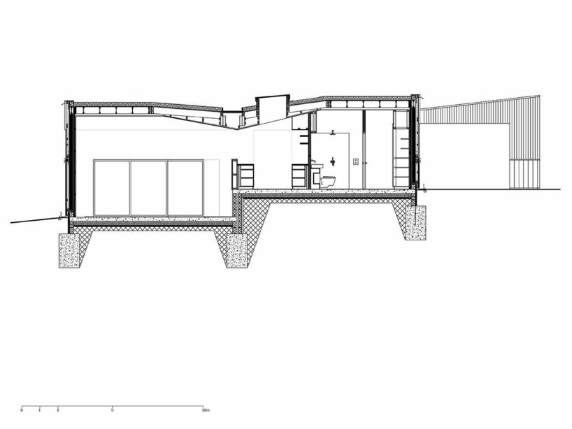 the project sits like a ring placed over the terrain, with its funnel-like roof forming a shaded perimeter walkway and an introverted core.