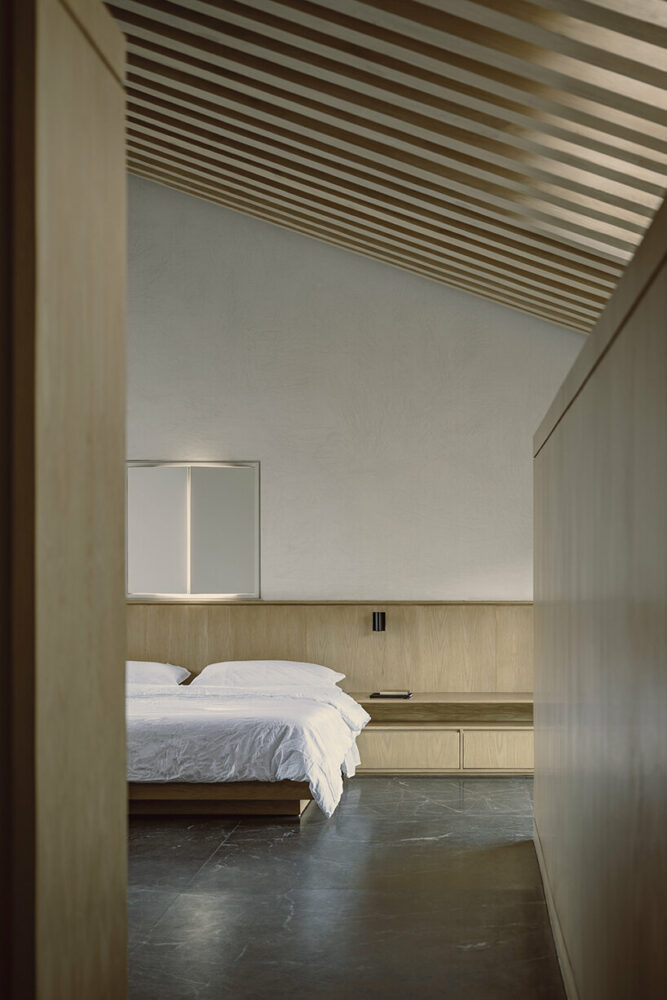 While the exterior is defined by the walls’ rocky tone and the foliage’s green texture, the indoors are dominated by wood — showing up in beams, bookshelves, closets, and furniture. Besides ‘warming up’ the place, the use of timber establishes yet another conversation with the landscape; its lightened tone complements the dark-colored exterior skin, the green surroundings, and the red window frames, which offer a striking contrast amid the toned-down context.