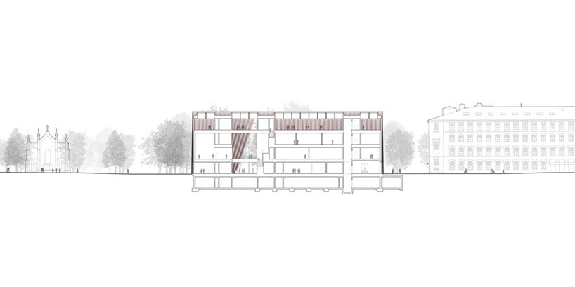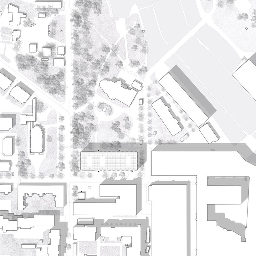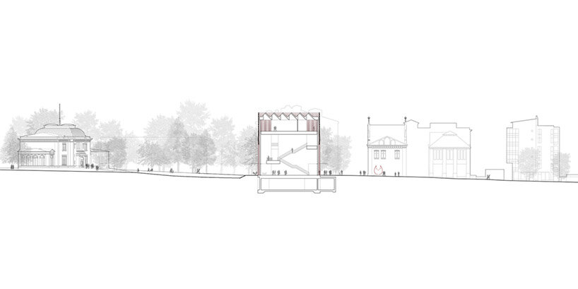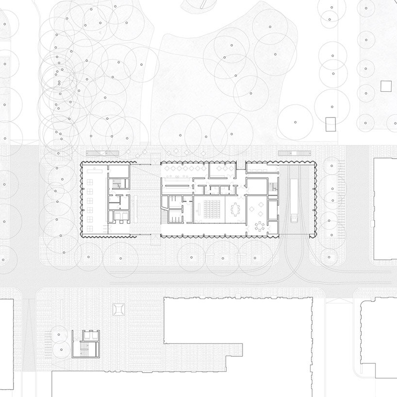 the project sits like a ring placed over the terrain, with its funnel-like roof forming a shaded perimeter walkway and an introverted core.