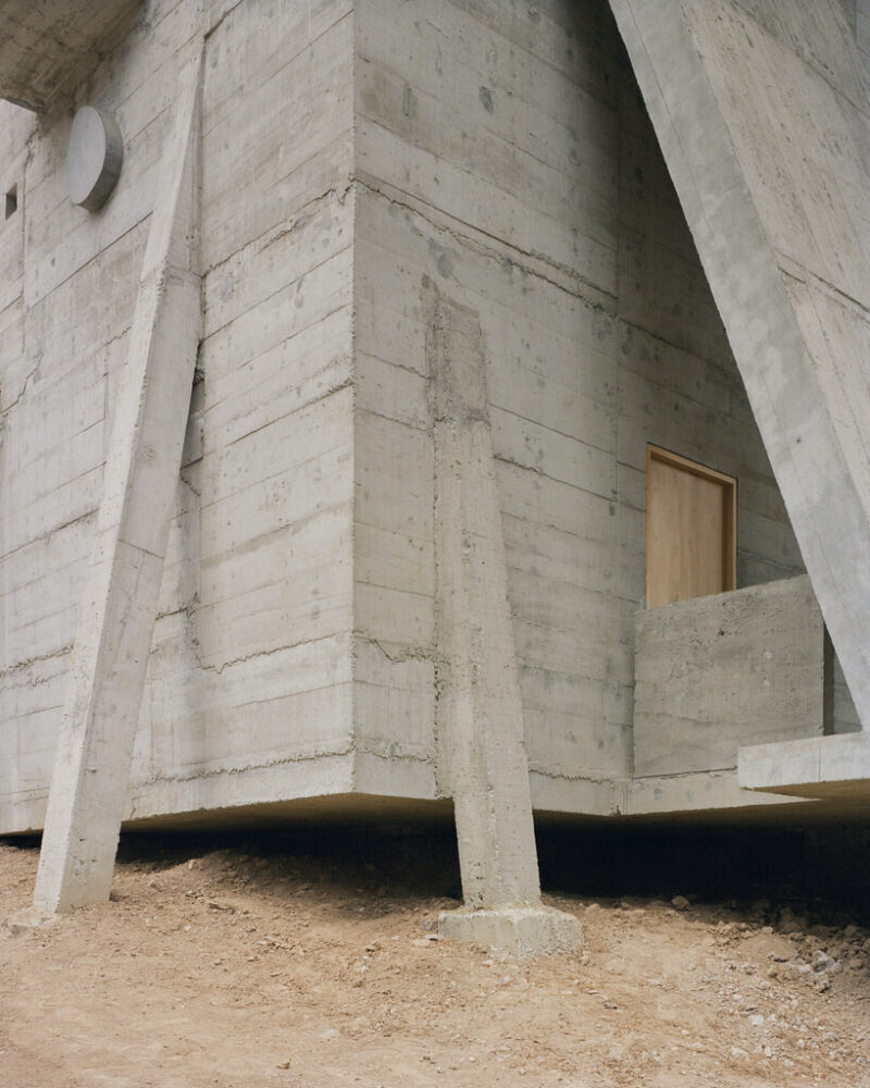 the project sits like a ring placed over the terrain, with its funnel-like roof forming a shaded perimeter walkway and an introverted core.