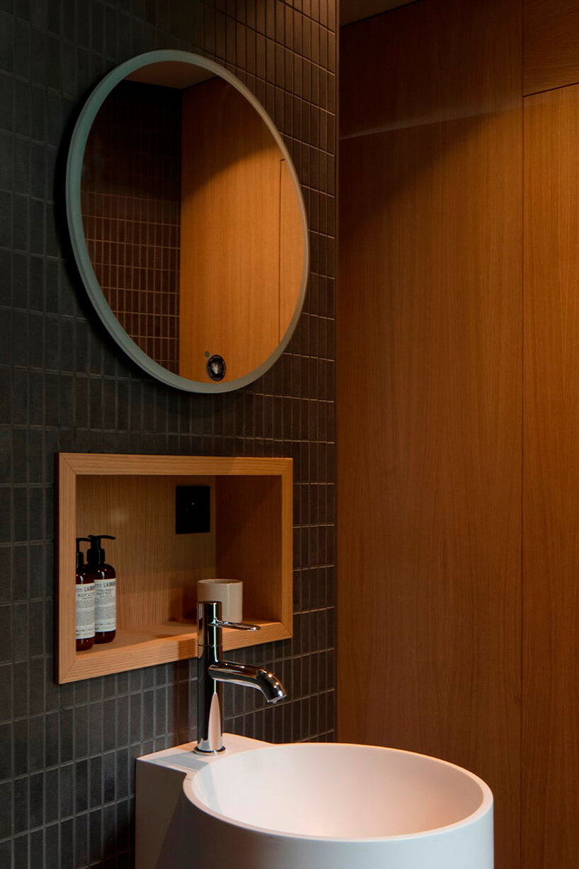 Embracing a minimalist configuration, LUMICENE’s design focuses on the essentials with no compromise in comfort. LumiPod is conceived and manufactured in the firm‘s workshop near Lyon, France, and is composed of two modules fully assembled off-site and then reunited on site. The front module hosts the bedroom and lounge area, with king size bed and bespoke central unit in natural oak with optimized storage units. The 120° reversible window opens completely to offer an incredible experience of immersion in the surrounding nature. The rear module fits the bathroom with shower, basin, and toilet, as well as floor to ceiling cupboard. Floor and walls are covered with MOSA anthracite ceramic tiles, and bathroom fittings are from AXOR.