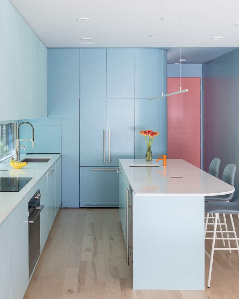 Inside the Fluevog House, the team at MA+HG Architecture continues its dialogue between convention and creative expression. The entry is marked by a blue foyer leading to a vividly patterned powder room, wrapped in custom wallpaper that nods to the client’s footwear brand. The kitchen is rendered in fluted millwork and anchored by a continuous window backsplash, which introduces daylight while maintaining privacy from the street.