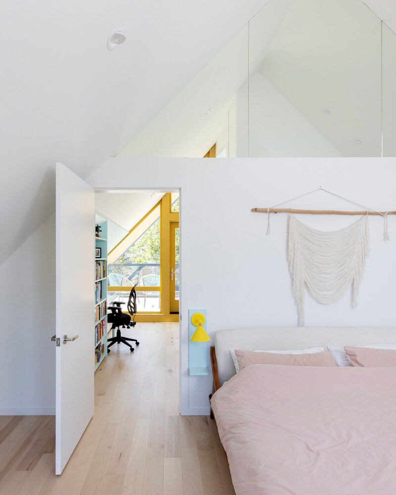On the top floor, the main suite is shaped by views and geometry. Triangular and circular apertures frame both interior moments and distant landscapes, while clerestory glazing brings natural light into circulation spaces. The bathroom is organized around a skylit bathing zone with a walk-through shower, and the adjacent study connects directly to the yellow roof deck.