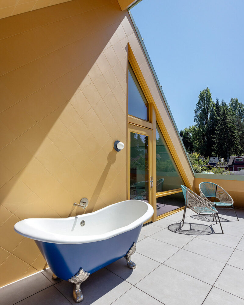 At the edge of the deck, a blue clawfoot tub faces outward through the circular roof cutout, offering a framed view over gabled rooftops, tree canopies, and the suggestion of mountain peaks beyond. This elevation becomes a point of quiet drama in the project, open to sky and softened by the curved roofline.