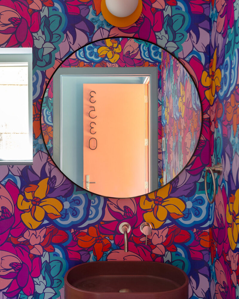interiors unfolds through boldly colored rooms and custom patterned wallpaper