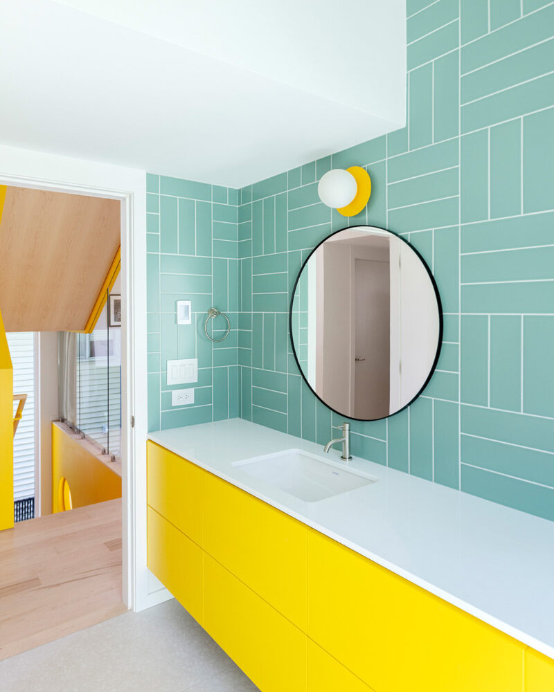 The main living area opens to the backyard through large doors as a central hub for family life. Upstairs, a bright yellow stair leads to a flexible second-floor space that accommodates a library, family room, and concealed guest quarters. Materials are chosen for their expressive quality — tile patterns shift playfully across walls and floors, and cabinetry remains vibrant.