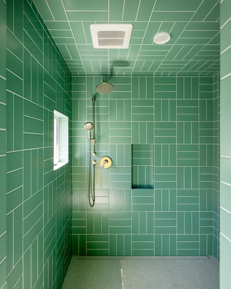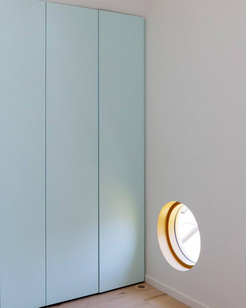 A sea green gable anchors the street-facing elevation, punctuated by triangular and circular windows that lend rhythm and clarity to the facade. The geometry feels deliberate, the result of controlled subtraction — such as the circular opening cut from the yellow roof deck overhead. This approach, which MA+HG describes as carving from pure form, extends to the use of stucco control joints, which trace lines across the exterior like the stitchwork of a handcrafted shoe.