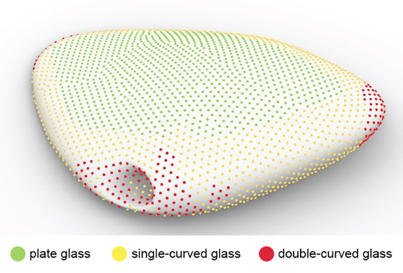 the project sits like a ring placed over the terrain, with its funnel-like roof forming a shaded perimeter walkway and an introverted core.