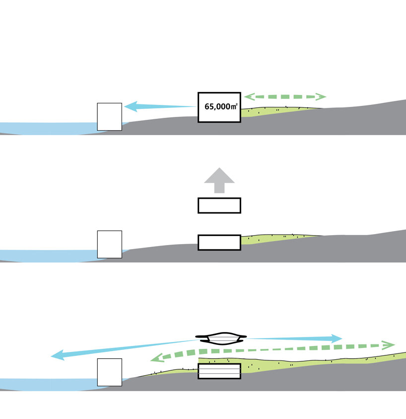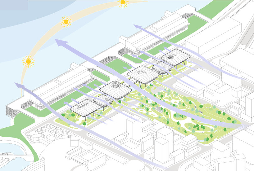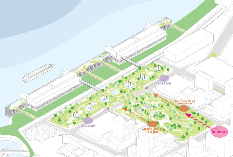 underneath the new park is the cruise centre hub, providing access to the ‘floating’ complex and the ground-level landscape park. the design of the cruise centre includes skylights to enhance natural light within the interior space, while an upper cantilevered building avoids overbearing direct sunlight.