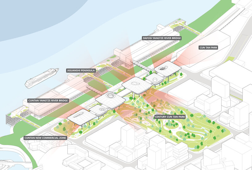 below the six elevated buildings will be the new cruise ship landscape park, which will connect to the century cuntan park on one side and the pier park on the other to create one 100,000 sqm urban green space. from here, visitors will be able to enjoy a unique perspective of chongqing and the yangtze.