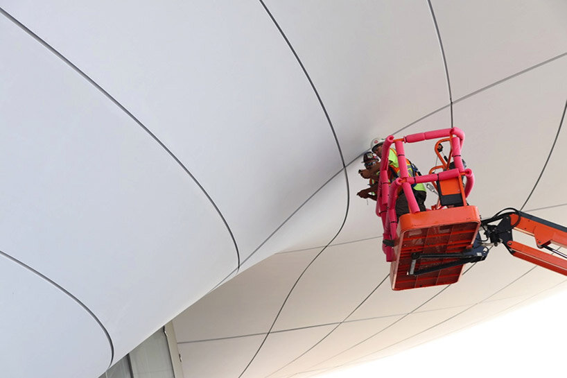 the project sits like a ring placed over the terrain, with its funnel-like roof forming a shaded perimeter walkway and an introverted core.