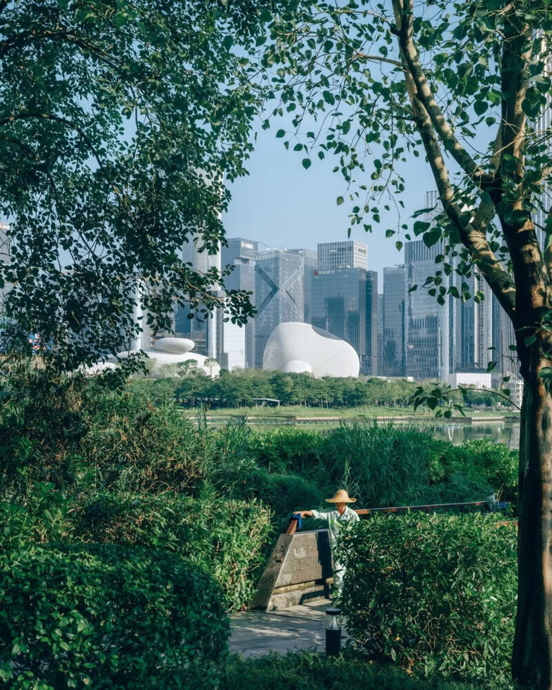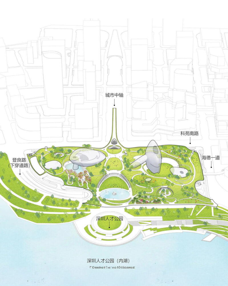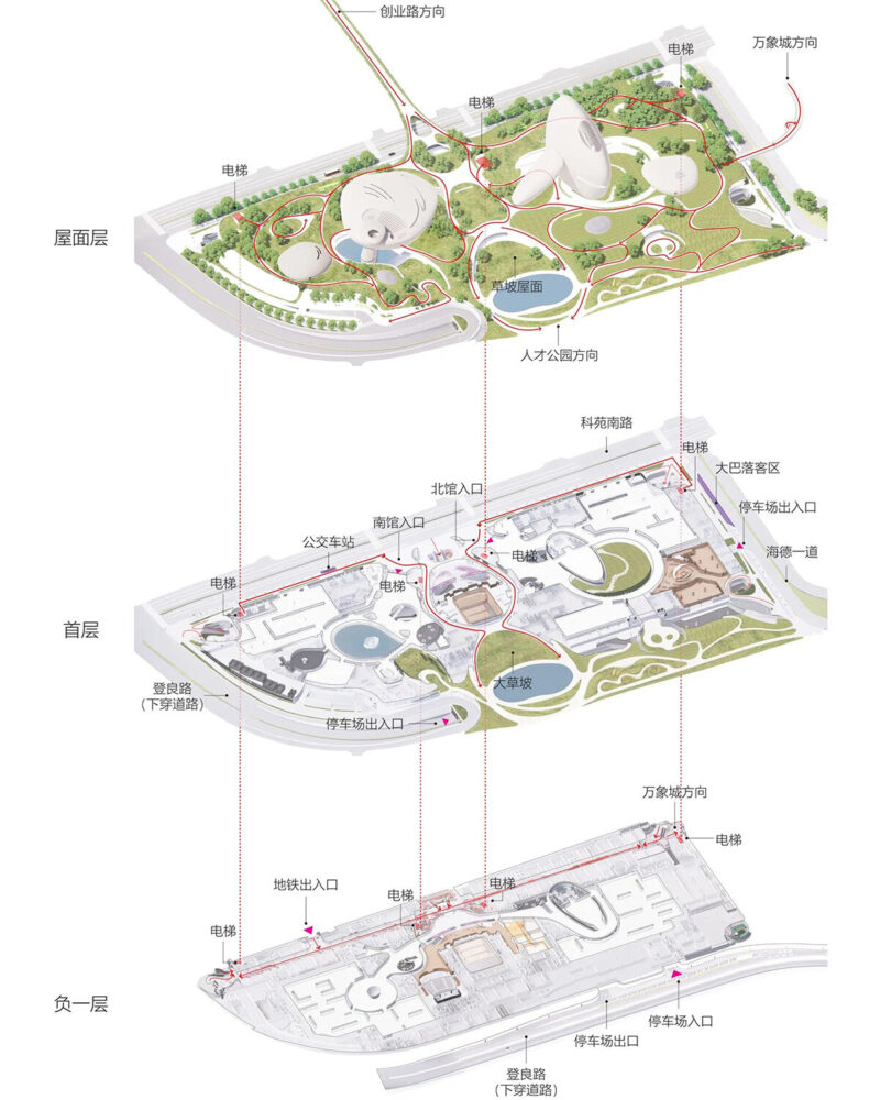 pedestrian bridges and cycling paths connect the plaza to city routes