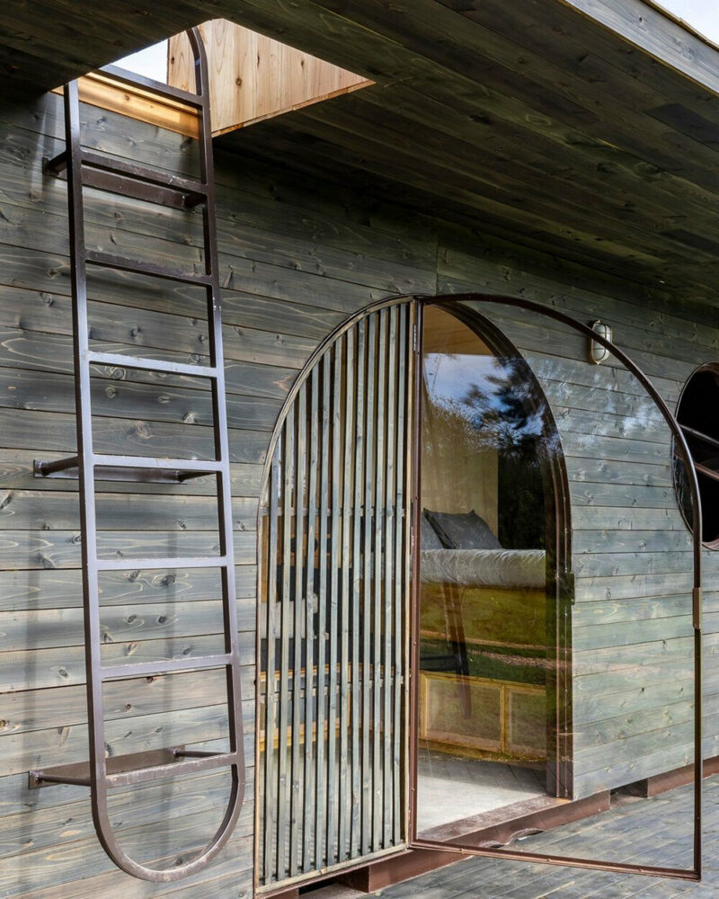 The CARGO Tiny House by Madeiguincho (see more here) features a small front porch, an arched doorway, a porthole window, and a ladder that guides guests to a sunken roof terrace. Stepping inside, a snug living space welcomes guests. The architects kept the layout simple and clear, tucking a raised bed and window at the edge, with storage underneath. Complementing the sleeping nest is an L-shaped kitchen and seating area, revealing hints of faded blue. Wooden panels engulf the interior walls with delicate warmth, while concrete floors balance out the brownish hues.