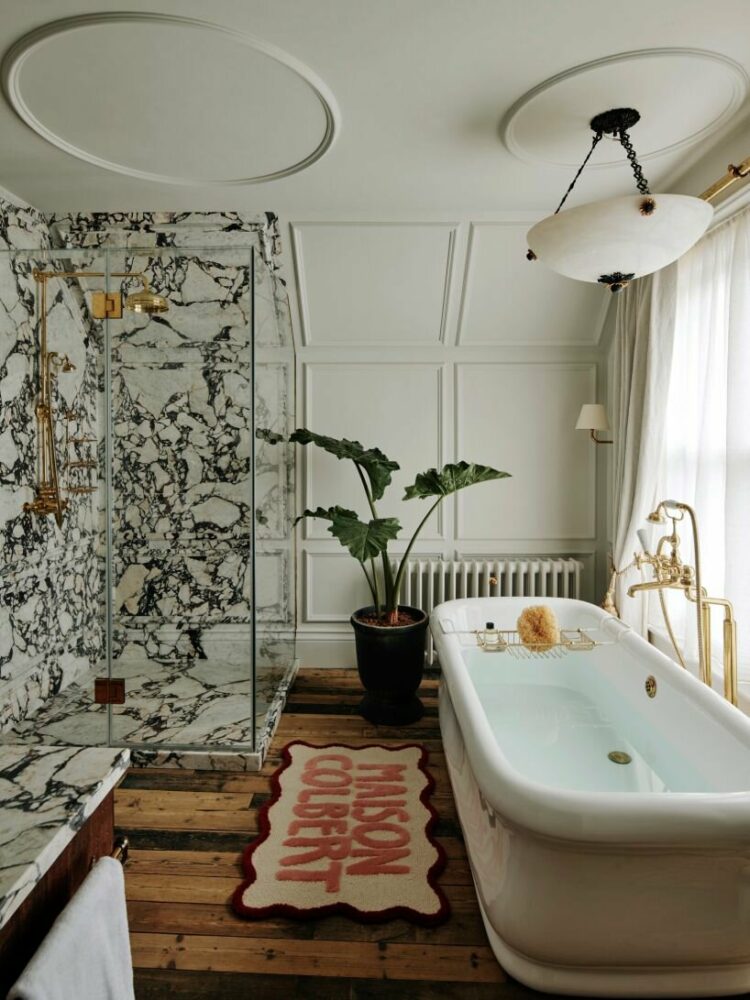 The space is carpeted with a collector’s dream, from a salvaged wood coffee table made by the French House to antique chairs, a pendant light, a trompe loile painting Buchanan Studio designed with the artist Ian Harper, and one of Charlotte Colbert’s sculptures ‘Vegetable Motherhood’ on a faux marble plinth.