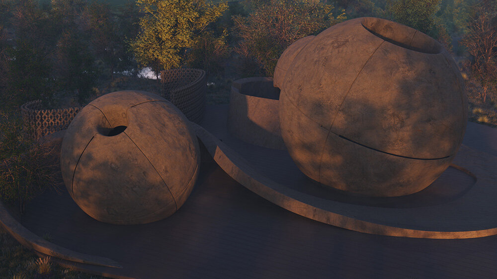 Once inside, visitors can join one of the three spheres, envisioned as large sloping balls with through holes made of adobe blocks – a mixture of unbaked clay, straw, and sand. These ‘living walls’ breathe, i.e., absorb excessive humidity, fumes, pollution, viruses, and microorganisms, and shield electromagnetic fields and radio waves. They even protect against cold in winter and heat in summer. MAKHNO Studio even installs a niche for a fire inside a KHRAM sphere, which can be lit for a tea party, covered up to leave the space free. Whether in the morning when the first sun rays break through the lace of the temple wall, in the afternoon, when the light creates a majestic picture inside the spheres, or in the evening, when the hearth starts glowing outward, visitors are welcome to enjoy the spaces, fully and deeply.