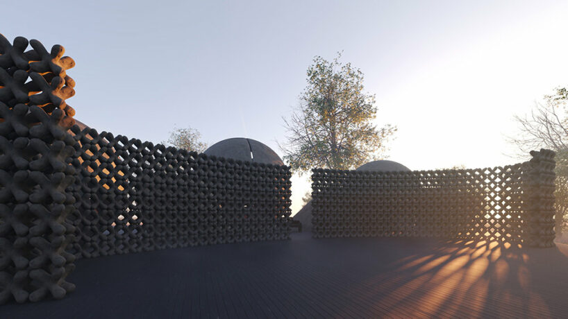 The KHRAM temple by MAKHNO Studio (see more here) consists of an open square, a three-dimensional figured wall at the entrance, and three separate spherical rooms for solitude, prayer, and meditation, in small architectural niches. Thus, from above, the architecture recalls a lotus fruit with three seeds – ‘a symbol of spiritual potential on the path to enlightenment,’ writes Serhii Makhno. The large, rounded square in front of the entrance nudges visitors to greet the temple, leave their shoes on the wooden floor, and walk inside a three-dimensional wall. This 3D wall, made of QUADROPOD ceramic blocks, is assembled in an intricate pattern. ‘And it is symbolic because KHRAM has no further fences,’ continues the architect.