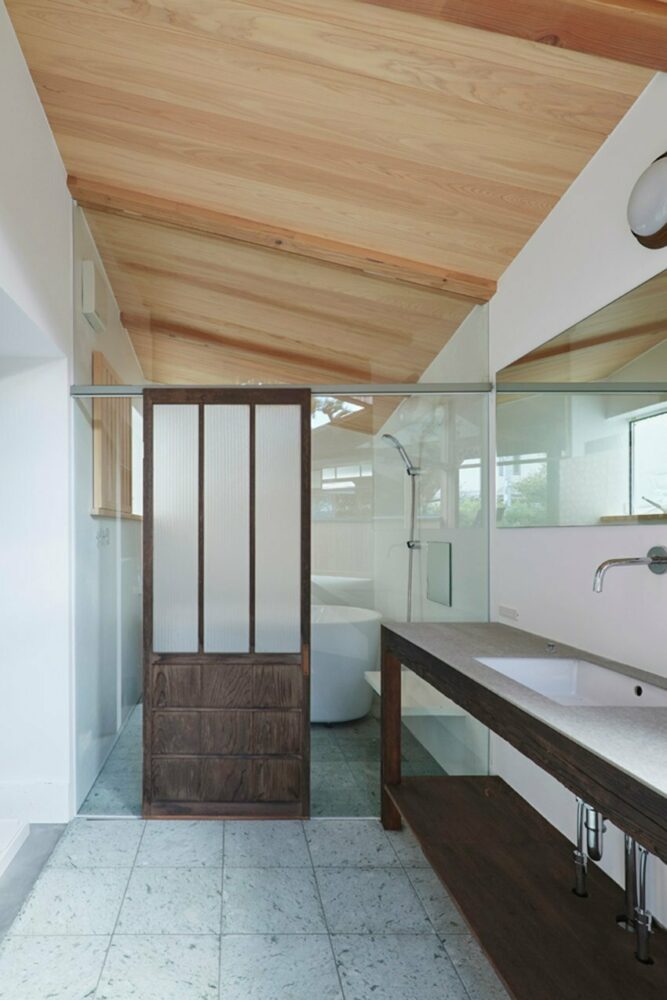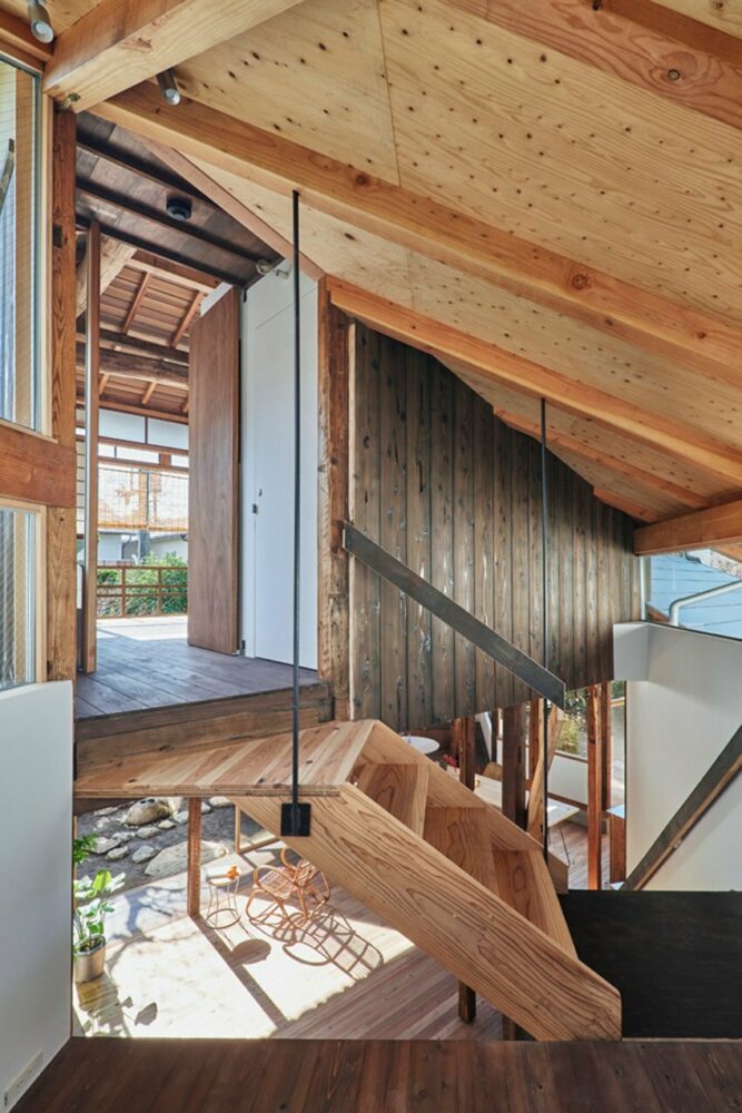 each lean-to projects outwards from the main house in correspondence to the garden. a living room surrounded by osmanthus trees, a kitchen with a high ceiling where sunlight enters, a tea room positioned like an annex next to the japanese maples, a bright staircase filled with light and a study with a view of the starry sky, a bathroom permeated by soft rays of light — these five lean-to spaces, while serving as interfaces connecting the old house with the garden, are also new structures that support the existing building like flying buttresses.