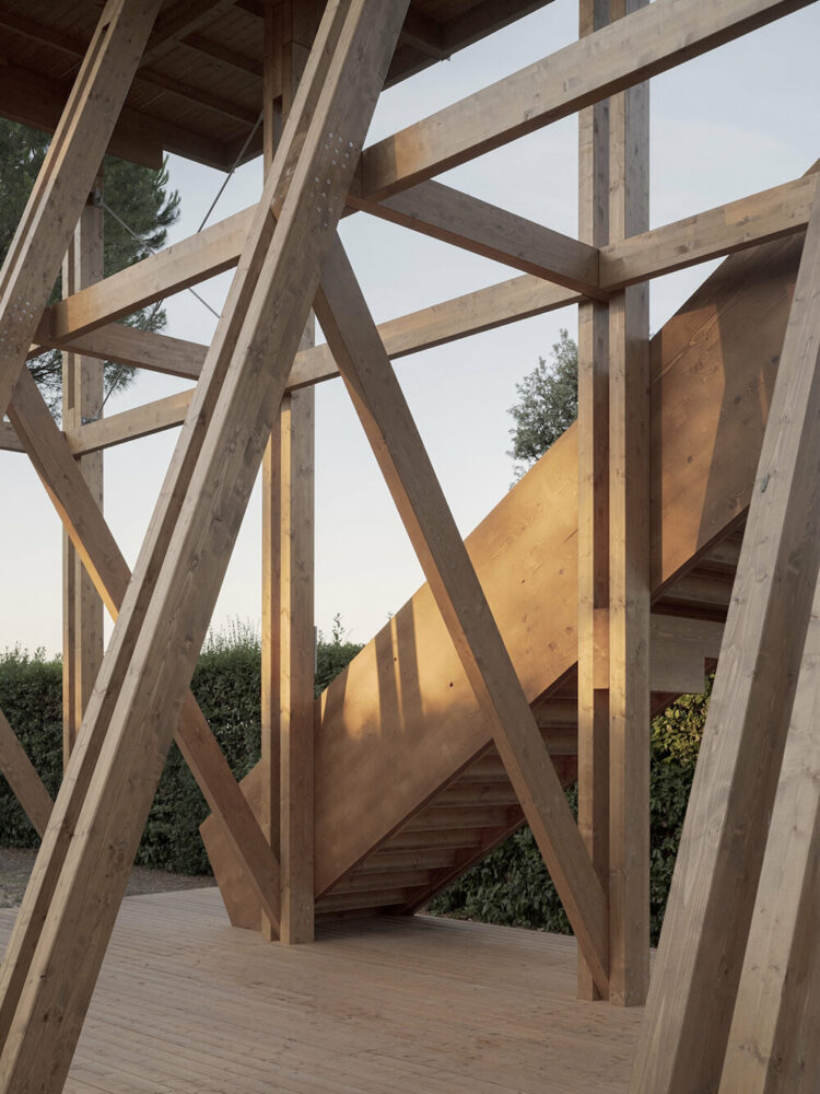 the project sits like a ring placed over the terrain, with its funnel-like roof forming a shaded perimeter walkway and an introverted core.