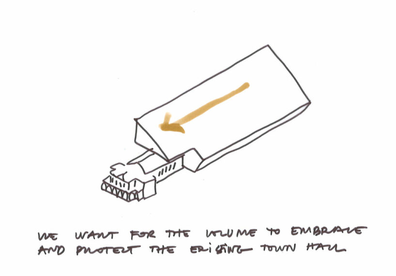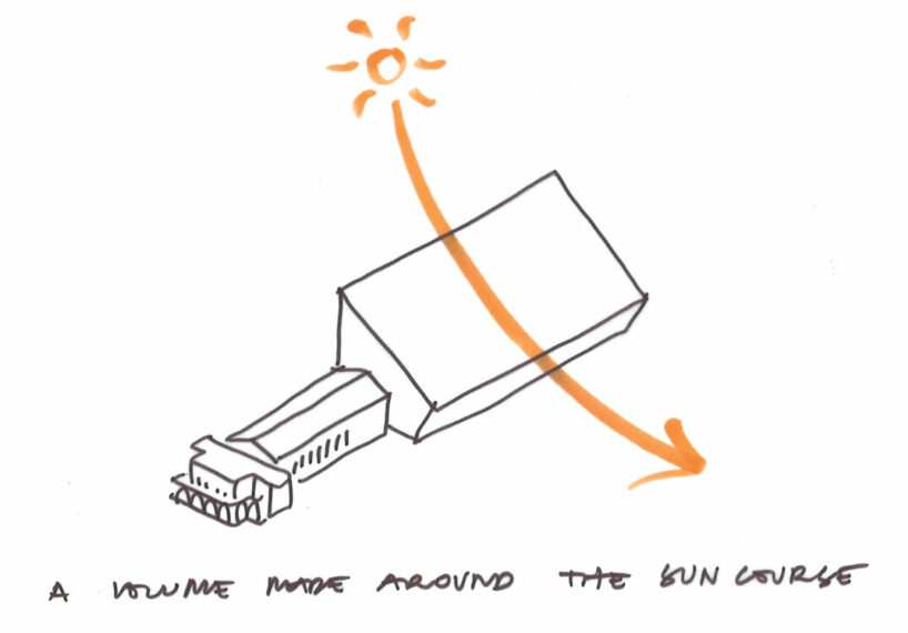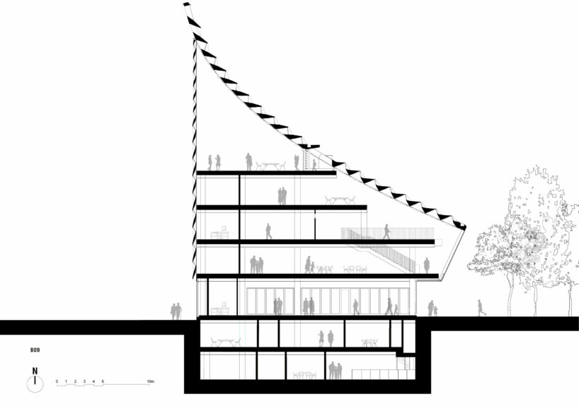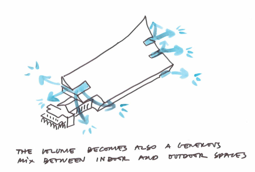 the project sits like a ring placed over the terrain, with its funnel-like roof forming a shaded perimeter walkway and an introverted core.
