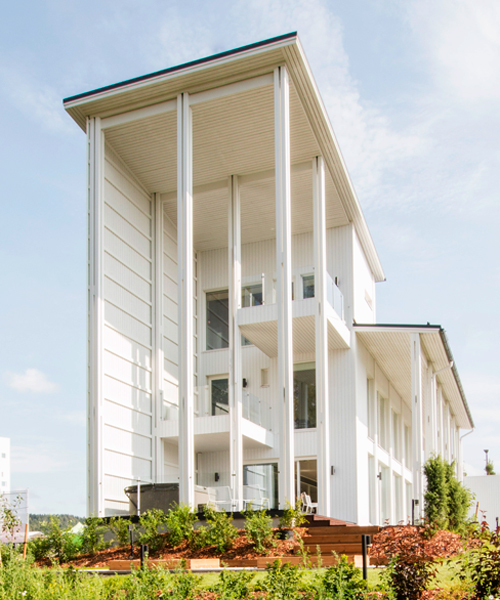 soaring on a landscaped site in jyväskylä, finland, ”villa muurame’ is an all-timber private residence conceived by marco casagrandethe stark white construction uses a combination of high-quality pine and spruce woods; the spatial elements were pre-fabricated during the winter in the finnish lapland then transported to site. the three-storey scheme sits by a lake, with each floor containing its own terrace to embrace its surroundings.