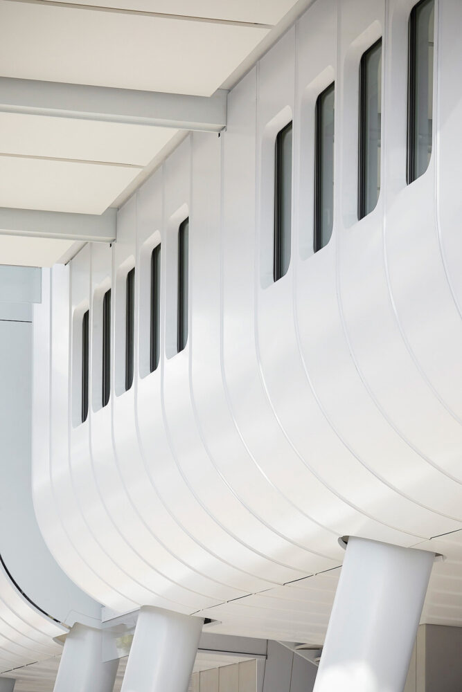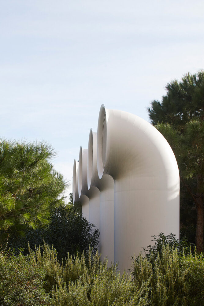 the project sits like a ring placed over the terrain, with its funnel-like roof forming a shaded perimeter walkway and an introverted core.