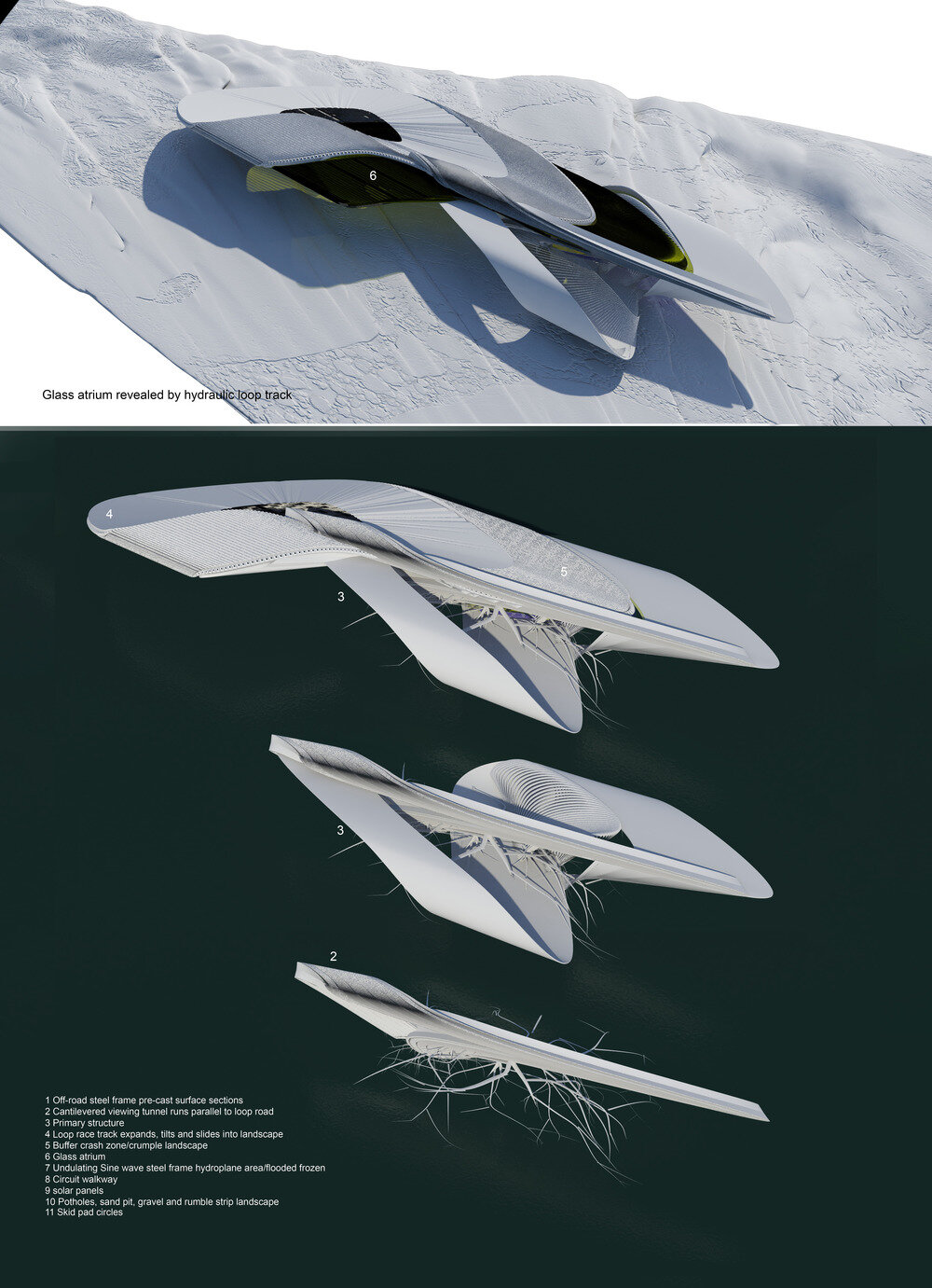 a continuation of the existing rock formations, the hotel is articulated as a series of stepped horizontal planes, courtyards, and gardens.