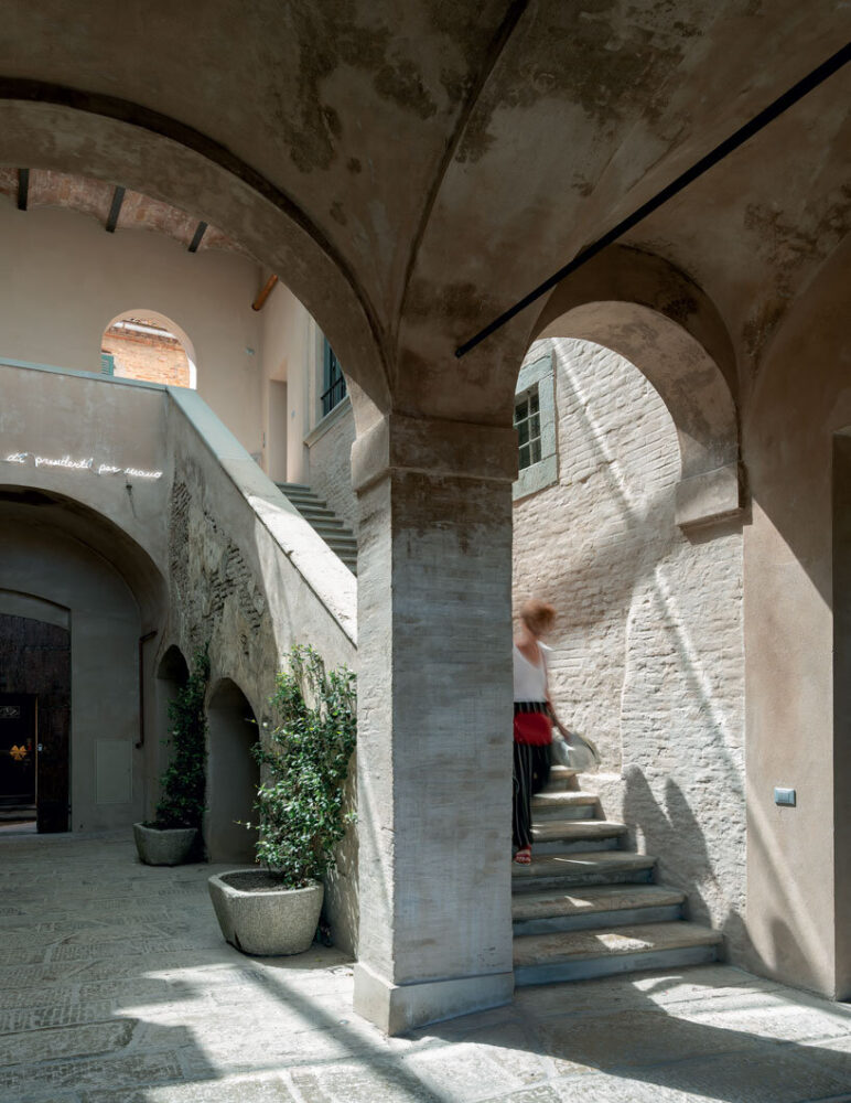 the internal organization of palazzo senza tempo is designed as ‘an adventure of visual surprise’, echoing the narrow, winding streets of old towns across italy. this adventure continues into the new extension, which features two monumental staircases—one internal and one external—and floor to ceiling windows.