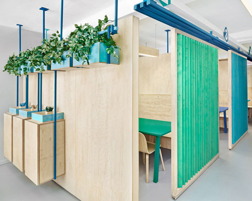 three-quarter height plywood walls are installed within the 123 square meter space, maximizing available natural light. between these partitions, an intimate series of learning zones is created where tutors are able to prepare students for college through english lessons and recital classes. the pod-like volumes can be enclosed with large retractable doors that slide into place.