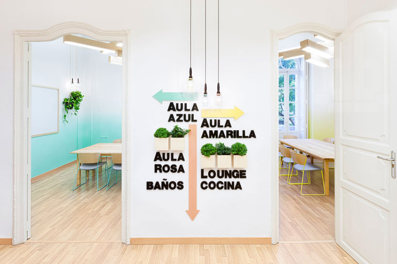 colorful classrooms in the 2day language school, valencia – designed by spanish firm masquespacio, revitalize the old schoolhouse. the spanish learning centre fuses the historic values of valencia with its modern and neoclassical architecture. three brand colors; blue, yellow and pink are used in each of the rooms to reflect the fundamental characteristics of language learning: the levels, the goal and the conversation. also based on the stages A, B and C established by the common european framework of reference for languages. the colors gradually fade up the wall symbolizing the progress in language learning.