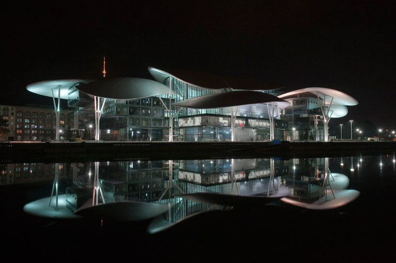 after two years of planning and construction, the ‘tbilisi public service hall’ designed by italian architects massimiliano and doriana fuksas of fuksas architects has been recently inaugurated in tbilisi, georgia. eleven diversely-shaped petals rise 35 meters above neighboring buildings of the urban and centrally located site to overlook the kura river. beneath the overlapping canopy, seven stacked volumes contain four levels of office space. their positioning envelopes a centralized public square, offering employees upward views to the underside of the roof and tree-columns. the branching pillars are positioned inside and outside the building to majestically support the roof entity, lifting it to be entirely separate from the building beneath. internal footbridges connect each of the levels for ease of circulation.