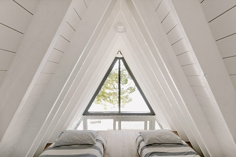 The concept of the interior design follows a series of fluid and relaxing spaces while offering a close relation to the lake. The architecture captures the natural landscape that unfolds beyond its structure and becomes fundamental to the living spaces, offering an intimate and cozy experience. The A-frame silhouette produces playful spaces, while continuously offering views towards the lake. The design team chooses lighter tones in shades of white and sage for the interior to promote a relaxed feel. Casual furnishings are decorated with rugs and linen accessories adding warmth to the living spaces. Local, sustainable, and durable materials, such as white pine flooring, exposed timber framing, and painted spruce boards, outline the structure. The exterior design applies durable materials like natural white cedar siding, metal roofing, and aluminum windows contributing to a controlled aging of the cabin without risking its longevity.