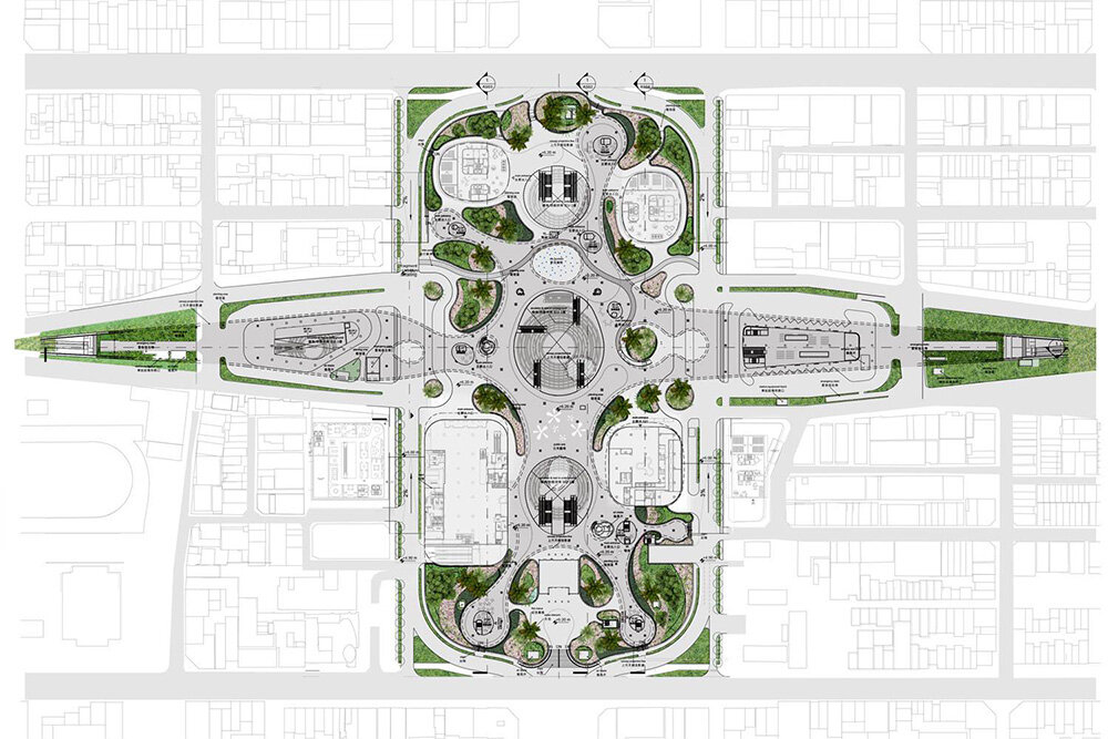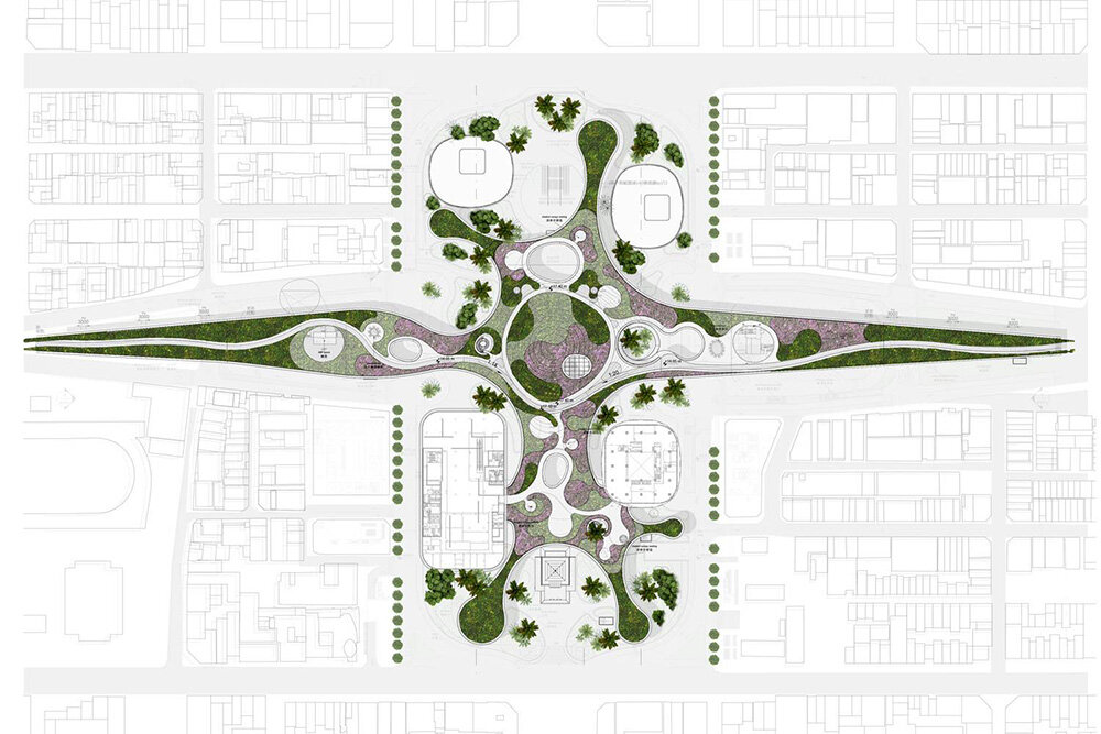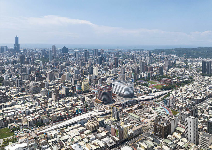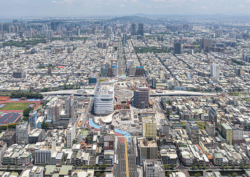 the landscaped canopy shields the open public plaza underneath from Kaohsiung’s tropical climate