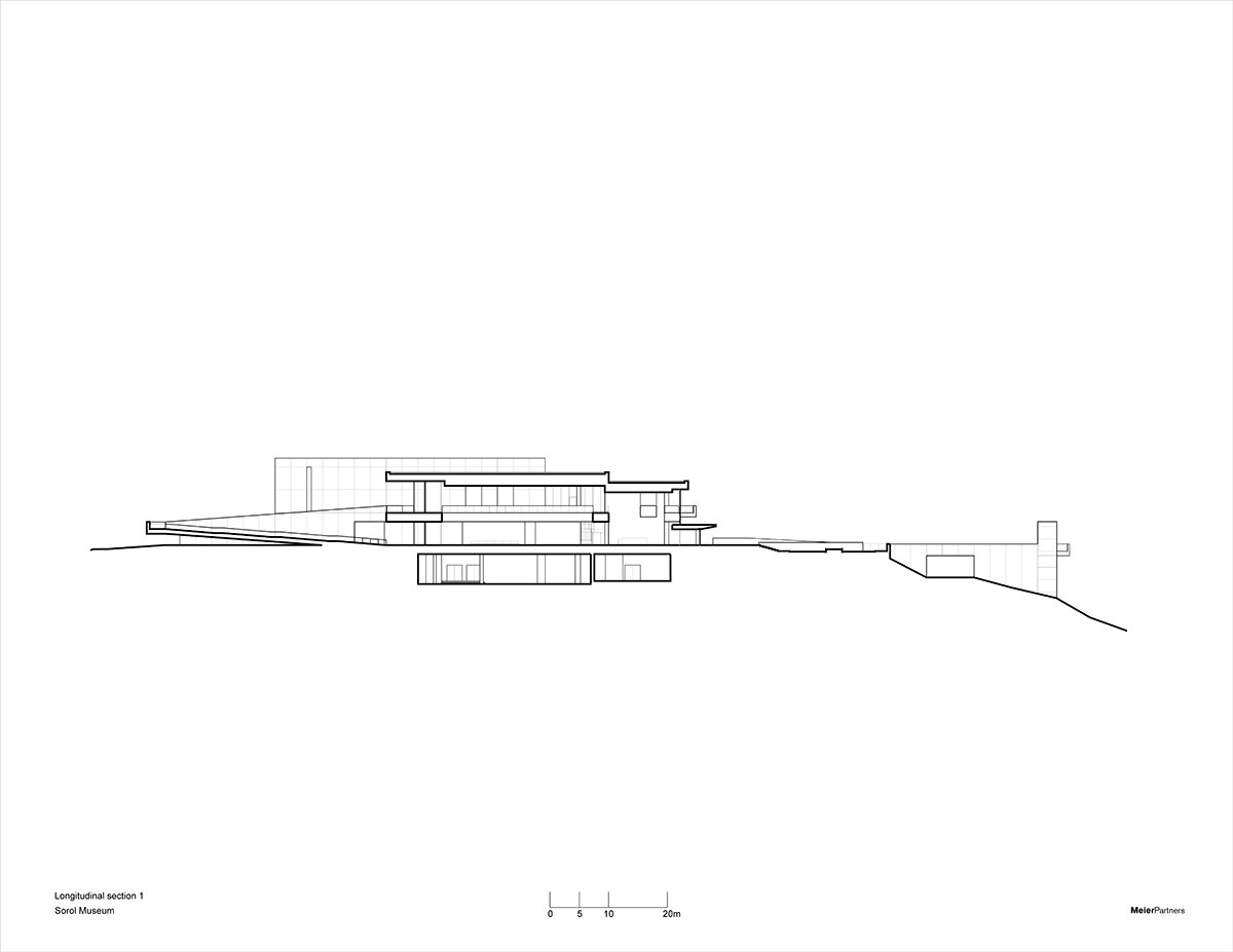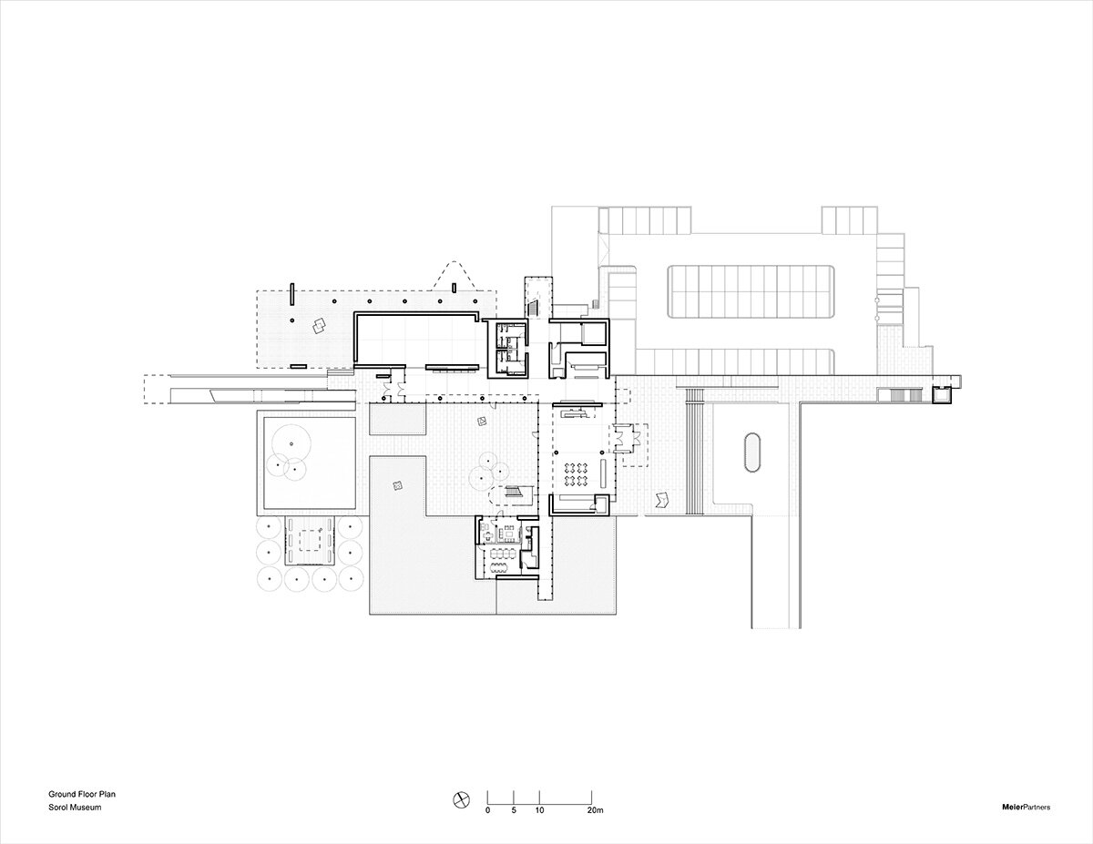 the project sits like a ring placed over the terrain, with its funnel-like roof forming a shaded perimeter walkway and an introverted core.