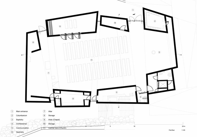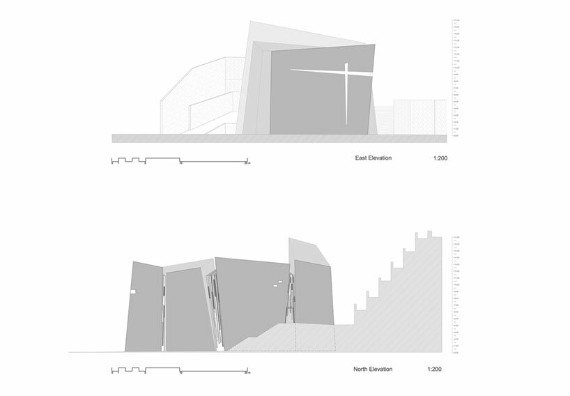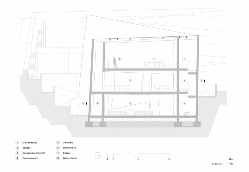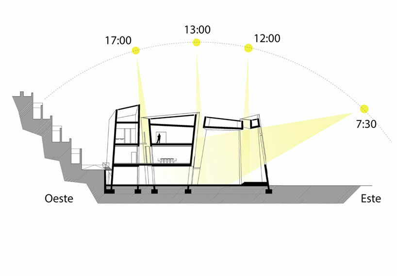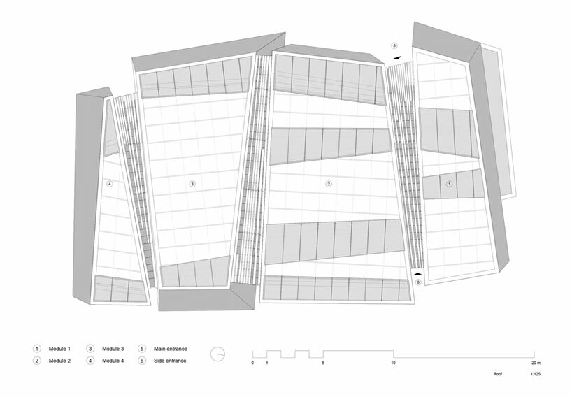 the project sits like a ring placed over the terrain, with its funnel-like roof forming a shaded perimeter walkway and an introverted core.