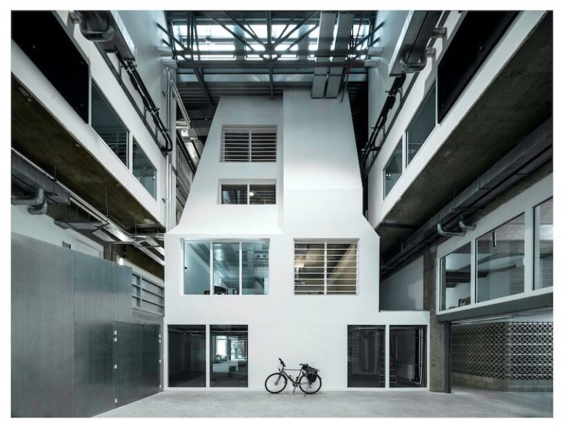 the main concept behind the design was to form a building that has an educational character, in the sense that people can experience the space in all its dimensions, length, width, and height. the architects (see more here) tried to avoid a reflexive approach that would like a large central atrium lined with offices. in contrast, they sought to invest the void as an experience of space and to reconnect with the industrial history of this historic building built in 1847.