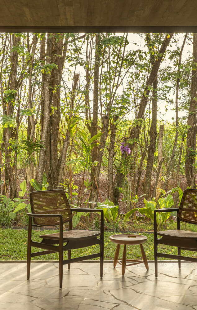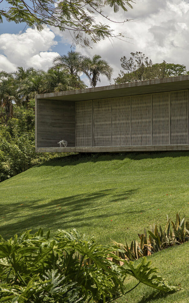the project sits like a ring placed over the terrain, with its funnel-like roof forming a shaded perimeter walkway and an introverted core.