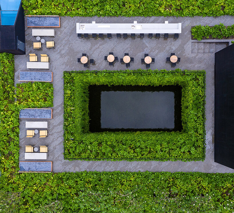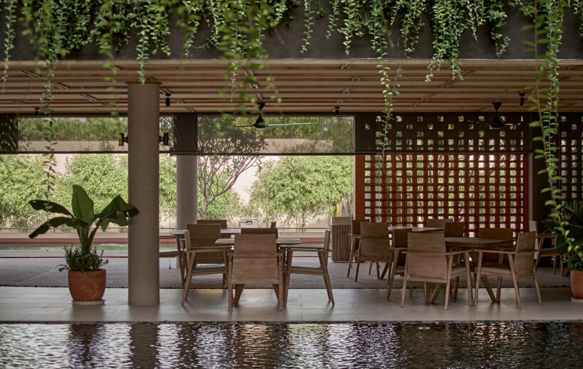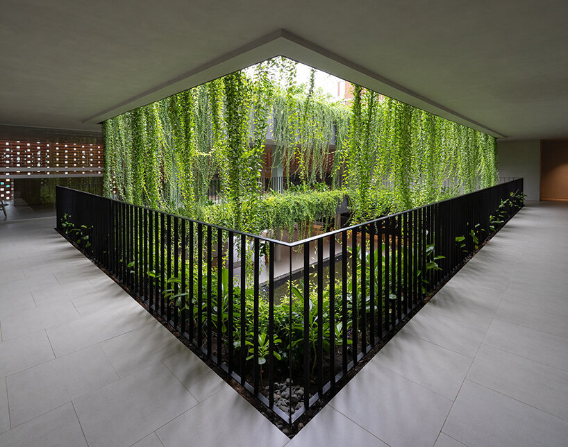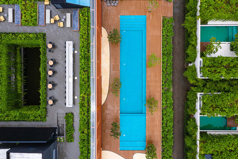 Beyond its aesthetic value, the brick cladding helps block out / soften heavy sunlight during warm weather while providing natural ventilation for the building, a prerequisite for tropical climates that drape over islands like Phu Quoc. Upon entering the Wyndham Club House by MIA Design Studio (see more here), visitors are met with highly sensorial spaces that mesh lighting, vegetation, and water features into one meditative setting. A striking example is the large skylight hovering above a zen-like pond; adorned with lush, hanging plants, such a display invites relaxation, visual softness, and breathability — a nod to the island’s overall ambiance. Further reinforcing the local character is the use of materials like bamboo, wood, and grindstone.