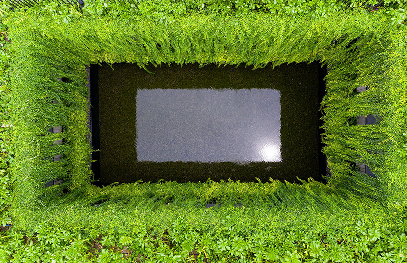 a large skylight adorned with hanging plants illuminates a large, meditative pond