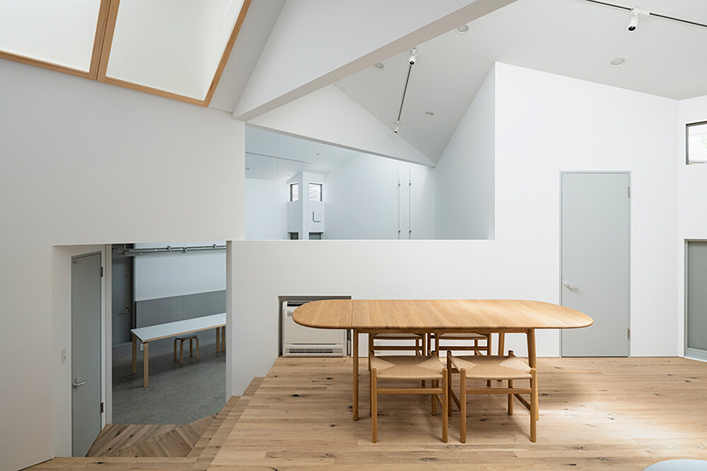 To make the most of sunlight, the building’s plan is slightly shifted from east to north, allowing morning and evening sunlight to enter with varying color temperatures. Afternoon sunlight is shaded out, while diffused light passes through frosted glass sloping windows. The transparent corrugated plate, with its spectral effect, allows light to pass through only once while selectively taking in light through the openings of the high windows.