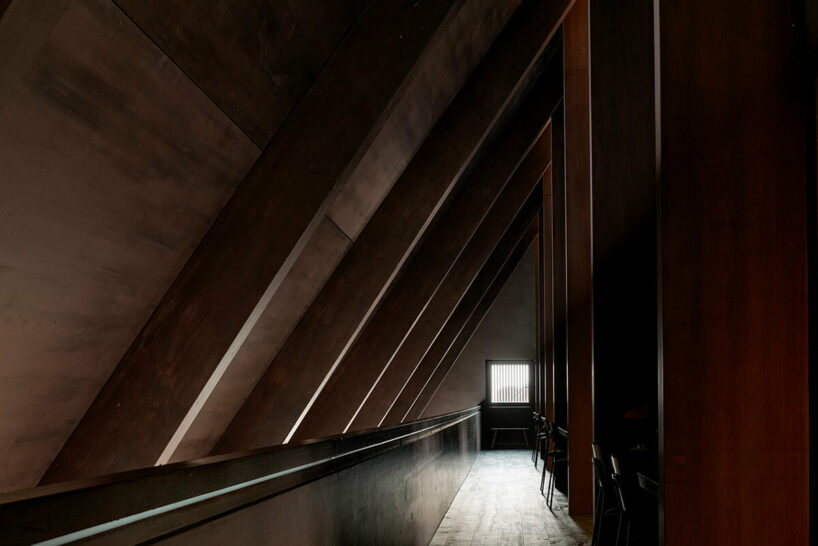 the project sits like a ring placed over the terrain, with its funnel-like roof forming a shaded perimeter walkway and an introverted core.