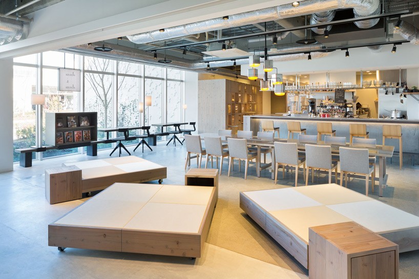 the designers at aki hamada architects and kentaro fujimoto describes the process of going to the bakery the same as going to the library, where they both involve the person choosing, taking it out and enjoying it in its context. for midi a midi bakery in kanagawa, japan, the interior approach highlights this bakery-meets-library experience which is highly appropriate as the pastry shop is adjoined to a bookshop. opposite the open kitchen, a bespoke timber shelving unit lines the wall- a distinctive feature, each square compartment is lit from within, highlighting the freshly baked goods while simultaneously evoking a feeling of accidental discovery. there are three types of seating available: the seating by the counter, on the long communal table and on the tatami styled movable platforms- this gives customers the freedom of choosing how they would prefer to dine depending on if they were by themselves or in a group.