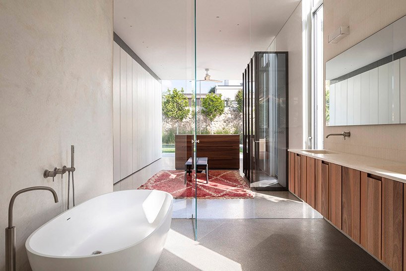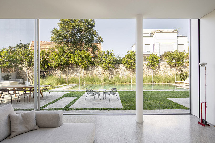 echoing the two-layer buffer, the team at milic harel architects defined the entrance to the residence as a ‘hole in the wall’, or a niche with a steel door. however upon entering Z house, visitors eventually discover the dramatic and exposed north façade. composed of four-meter high and floor-to-ceiling glass paneling that appears to be floating above ground, the façade offers an extensive view to the rear garden — bringing together the indoor and outdoor spaces. counteracting yet again that level of exposure, an elevation of the entrance floor and back garden allows for guestrooms to sit at half levels, both above and below the entrance to keep only one floor visible from street level.