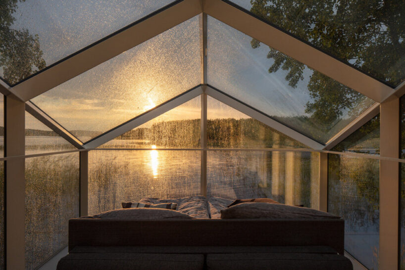 ‘our goal was to design a space that enables one to experience nature in all its majestic beauty from the comfort of a king-size bed,’ notes pirinen & salo. for the construction of ‘lucia smart’, the finnish creative studio has combined glass with a triangular steel beam structure in black. the mirrored glass volume that wraps the cabin’s exterior sits on a black steel floor ribbon, while the entire construction is supported by a series of black steel stilts that elevate it from the ground. meanwhile, a stepped wooden base takes users to an outdoor terrace located right in front of the lake.