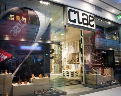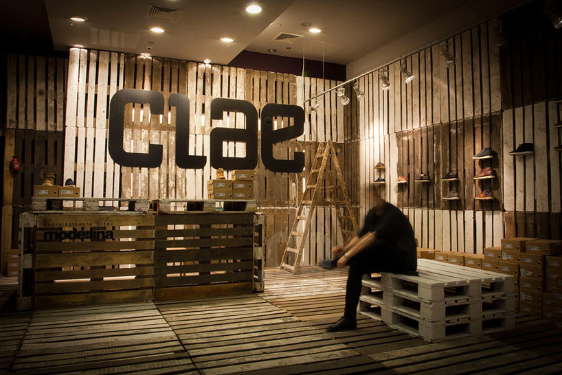 polish architecture firm, mode:lina architekci  has reused pallets from a previous project to fit out the temporary store for ‘clae footwear’ in poznań’s galeria malta shopping mall. the industrial material clads the space in a continuous pattern, resembling typical floor boards or wall paneling at a portion of the cost. turned on end, the palettes form centralized display areas, and when stacked, they serve as benches for customers trying on merchandise. unfinished wooden ladders and partially whitewashed elements add to the refined warehouse feel. maintaining the simplicity of the design, an array of wall-mounted shoes appears to float around the perimeter and are supported by long screws extending from the vertical platforms. boxes placed strategically around the shop add texture, and put stock close at hand for a convenient shopping experience. in contrast to the rough interior, the storefront is enclosed in smooth glass and high definition advertising panels. reflecting the tectonic change and lack of supporting material for cantilevered components, cardboard boxes of various dimensions become staggered stages.