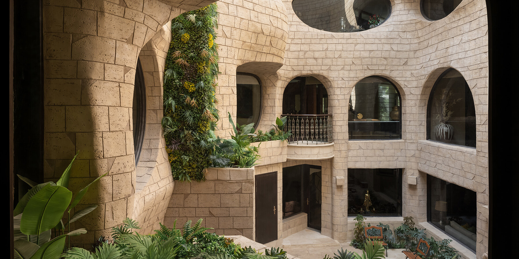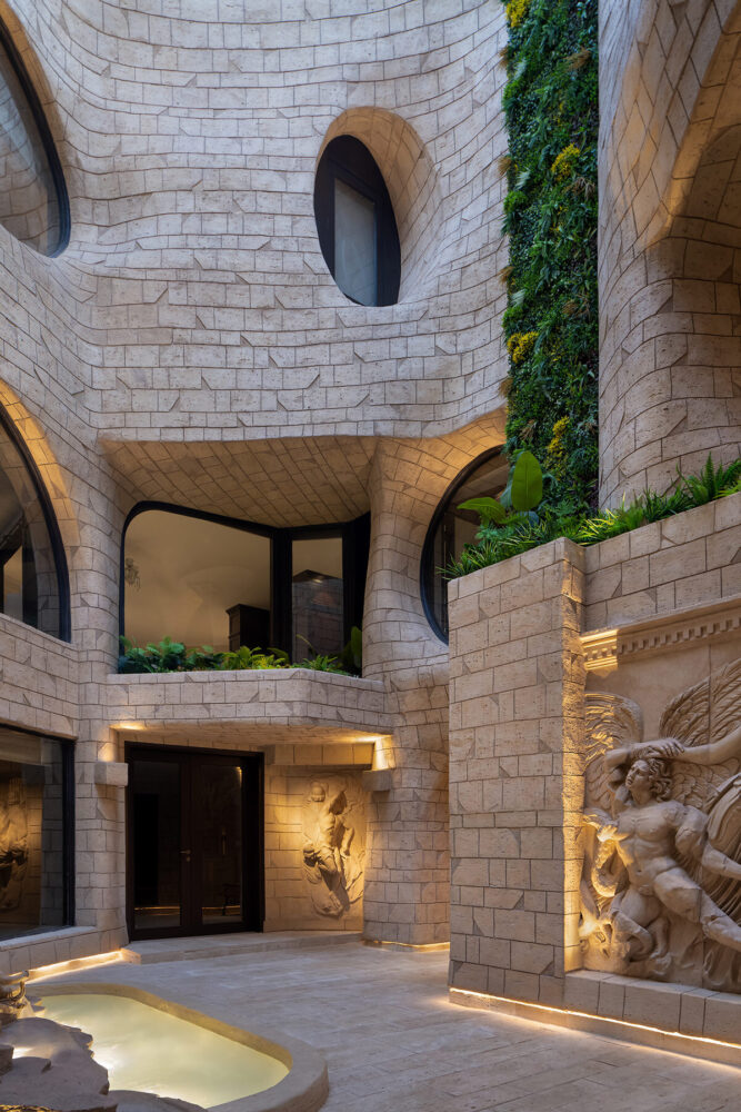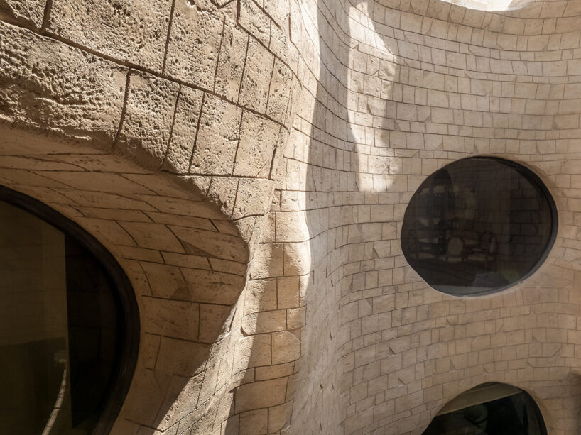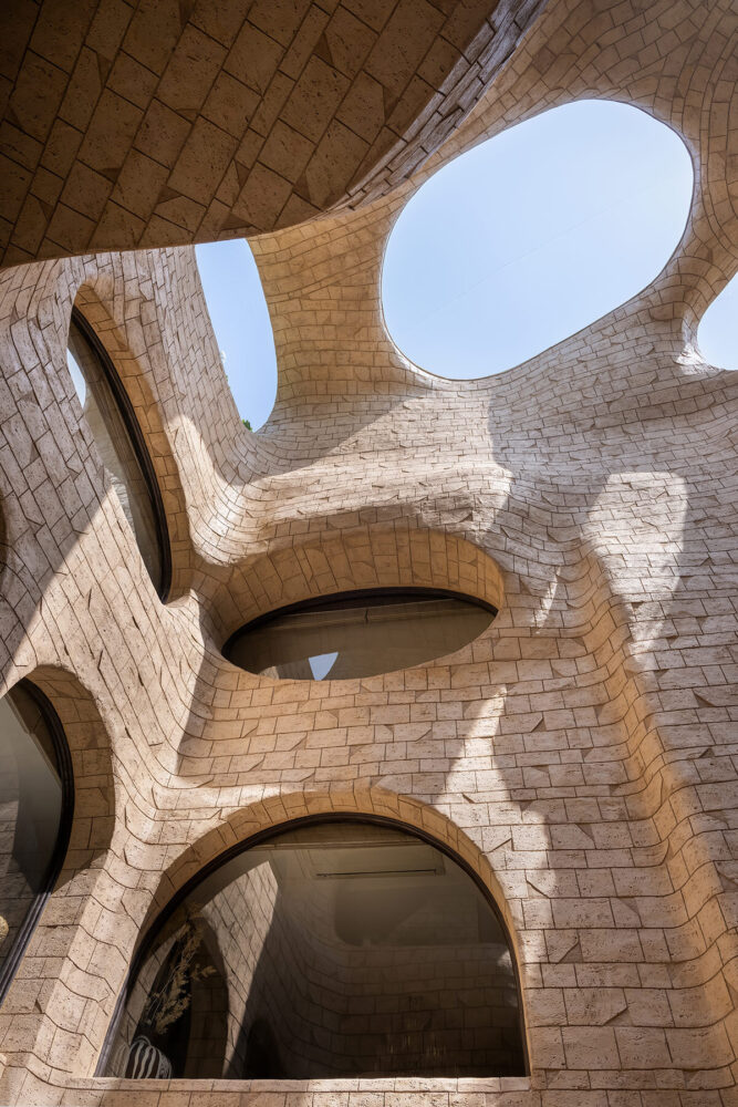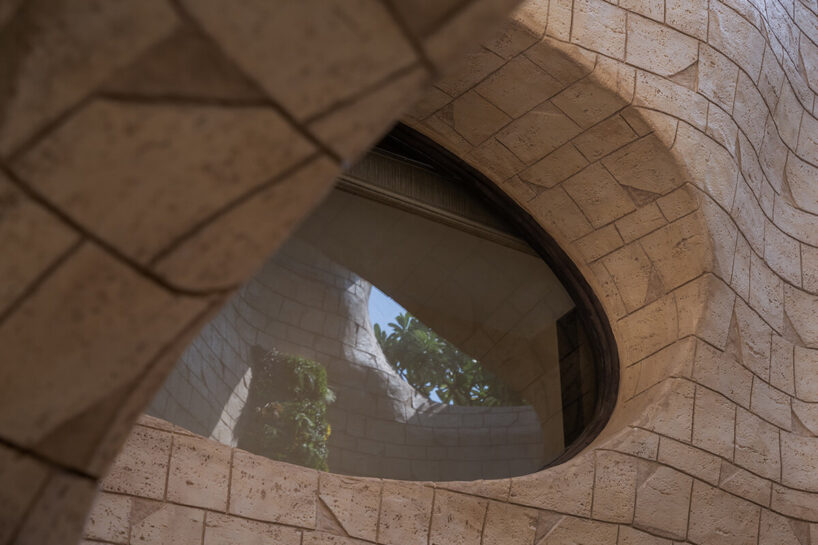 the project sits like a ring placed over the terrain, with its funnel-like roof forming a shaded perimeter walkway and an introverted core.