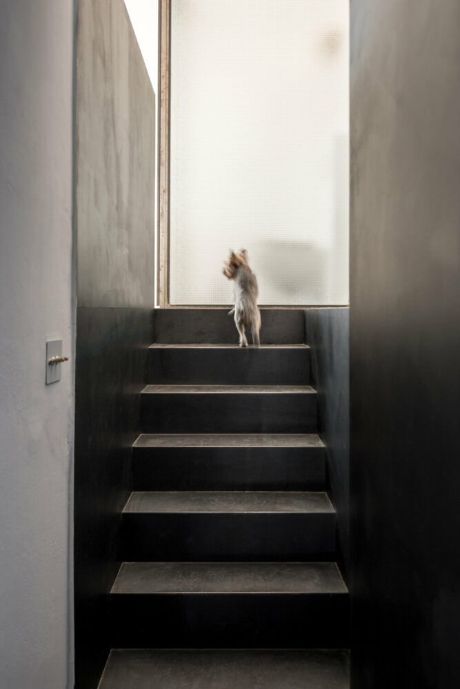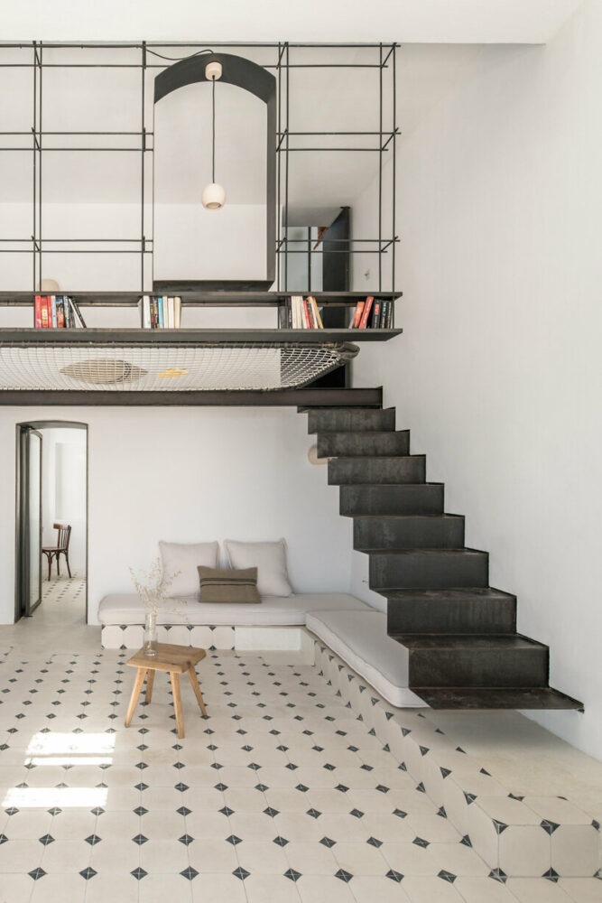 MOLD Architects‘ innovative approach was underpinned by the desire to maximize functionality while minimizing material use. They implemented a three-dimensional grid of steel bars that stretches from floor to ceiling, creating a light and airy aesthetic in contrast to the building’s original heavy and solid stonework. This versatile scaffolding system integrates various elements, such as kitchen equipment, bookshelves, lighting fixtures, stairs, and even spaces for relaxation and play in the form of a net-like platform hovering above the living area.